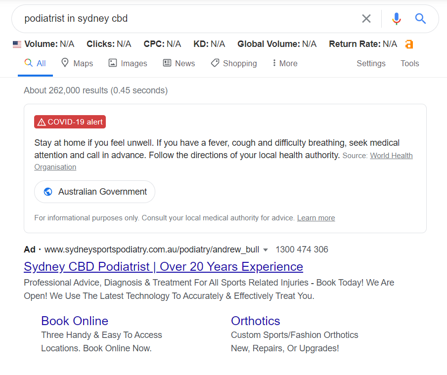 While the number of searches for “podiatrist in Sydney CBD” is far fewer than “podiatrist near me”, the price for each click is negligible. It should be noted that just because the CPC is showing up as N/A in Ahrefs, it doesn’t mean the keyword is free, just that there is not a great deal of competition.