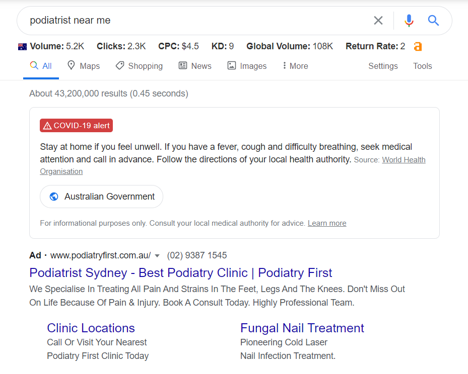 Once Google has decided on which ads to serve with the search, the “winners” are shown above the search results. According to Ahrefs, the estimated cost per click for “podiatrist near me” is around $4.50 , meaning that the advertisers shown will be charged around $4.50 for every click through to their site.