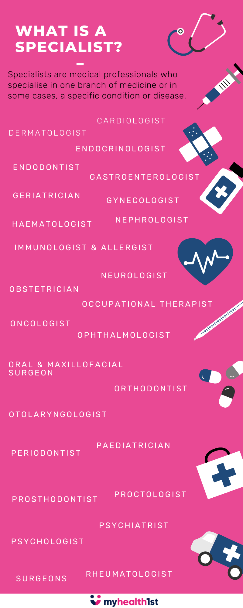 *It should be noted that most specialisations also have sub-specialisations, such as a paediatric oncologist, a specialist in childhood cancers, or a surgical otolaryngologist, a surgeon who specialises in operations of the head and neck.