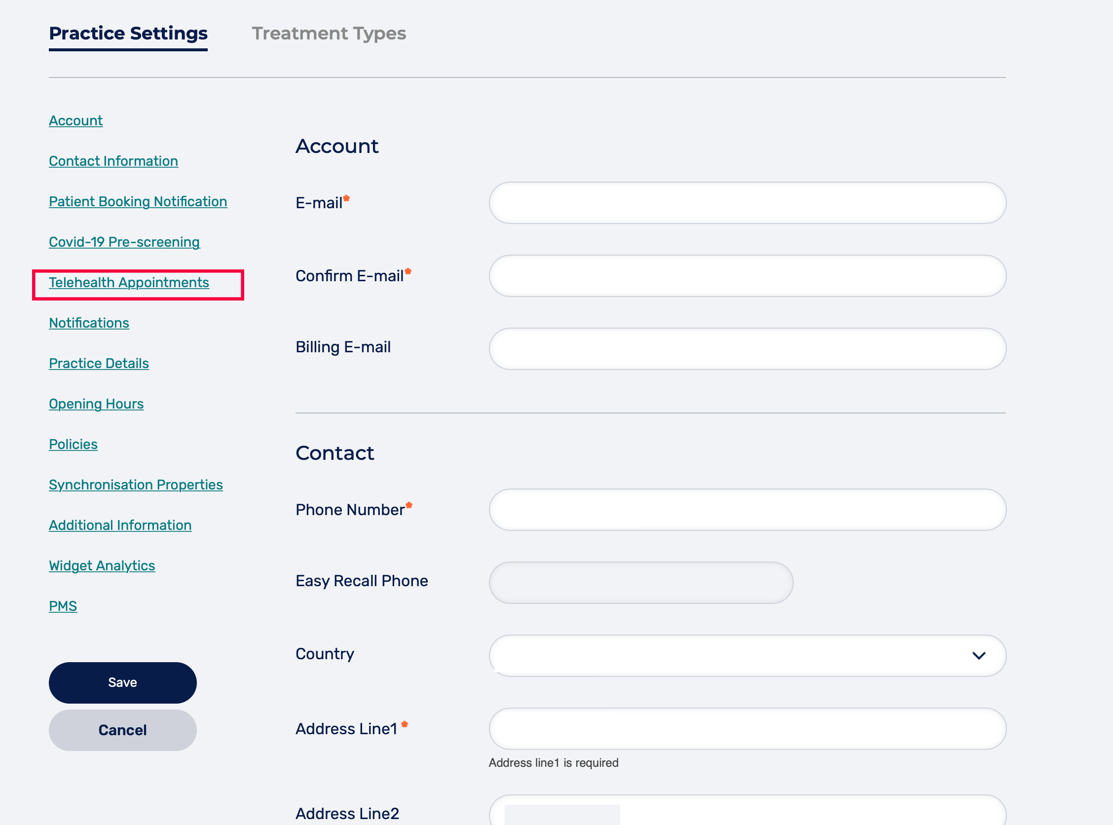 At least 1 Telehealth treatment type must be enabled before proceeding with the setup. After Telehealth treatment types have been set up, navigate to Practice Settings .
