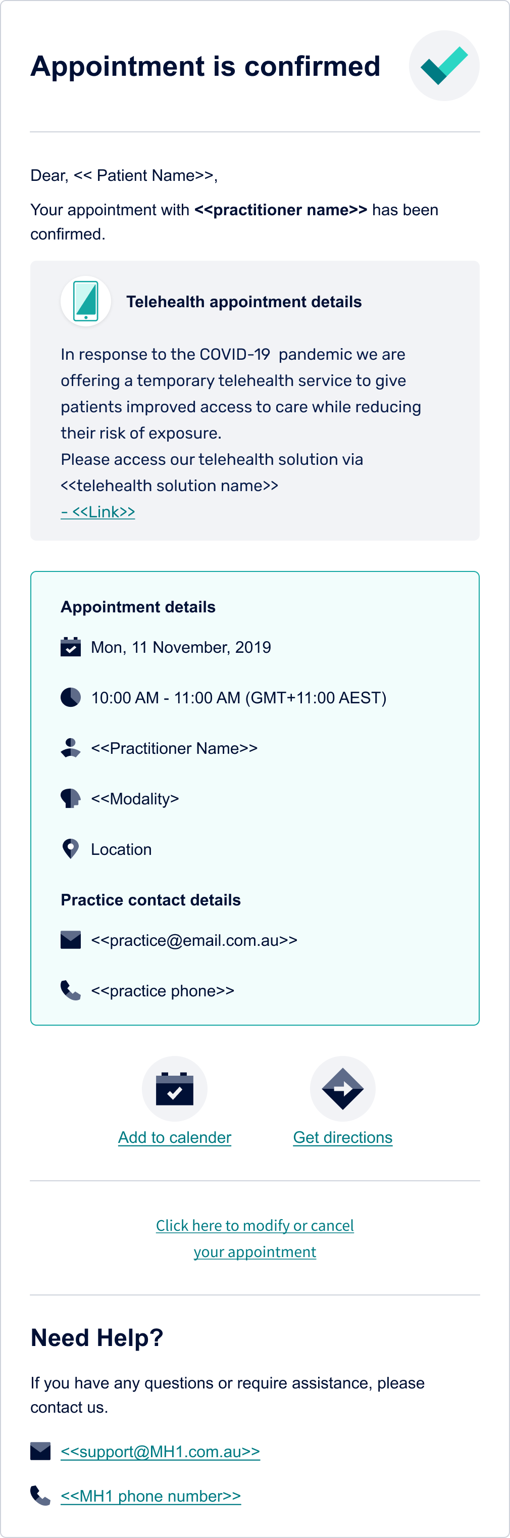 The patient will be sent a confirmation email containing all of the information they were shown on the booking confirmation screen. Practices also have the ability to schedule a duplicate reminder email.