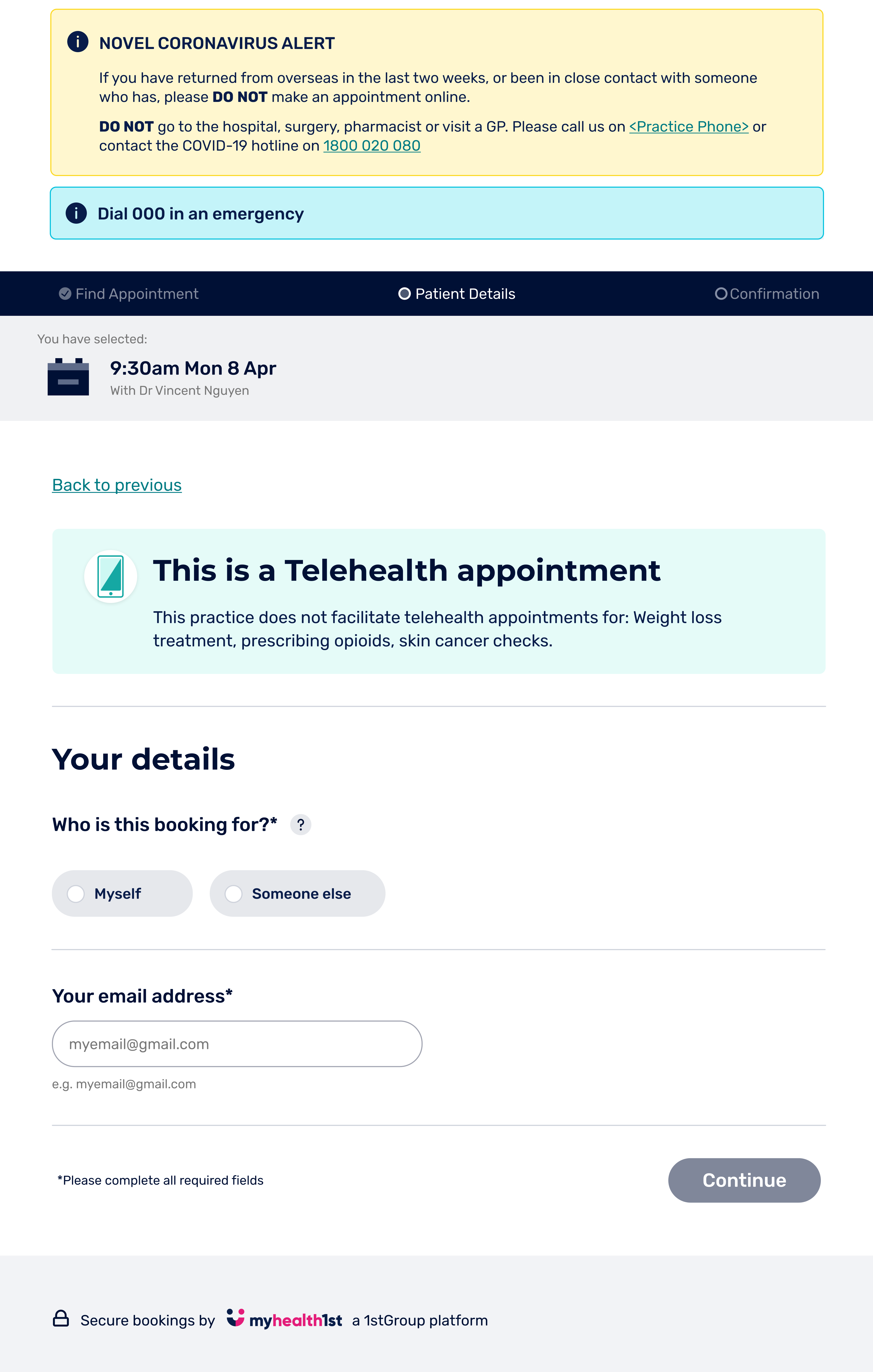 “Telehealth appointments are available for a range of health issues, but if you feel you need to direct treatment for an injury or a physical examination you may need to book an in-person appointment”