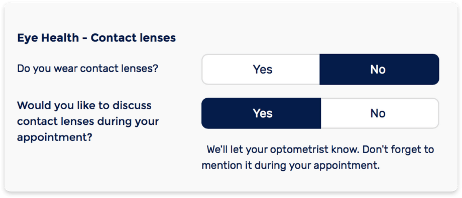 Internationally, 25% of people who wear glasses also wear contact lenses. But in Australia it is around 5%. Our campaign demonstrated that we were able to lift that to an average of 21% for practices on the program. A win for all stakeholders including patients who benefit from this option of improving their lifestyle. At no time did our platform share ANY patient personal details with a third party . See below just one element of the current workings of the campaign process in the MyHealth1st platform during the online appointment booking process, and note the very clear and transparent communications with the patient:
