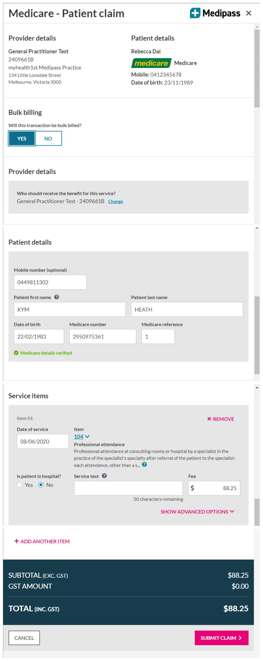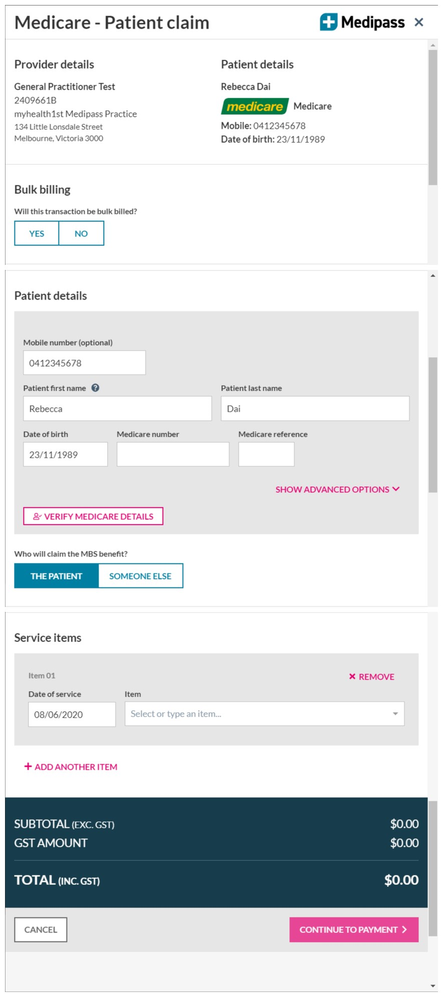 This allows for Private Billing (including the option for a patient to pay via Apple Pay or Google Pay, or for the provider to enter cards on their behalf), Medicare Claiming (including Bulk Billing and Patient Claims) and DVA Claims.