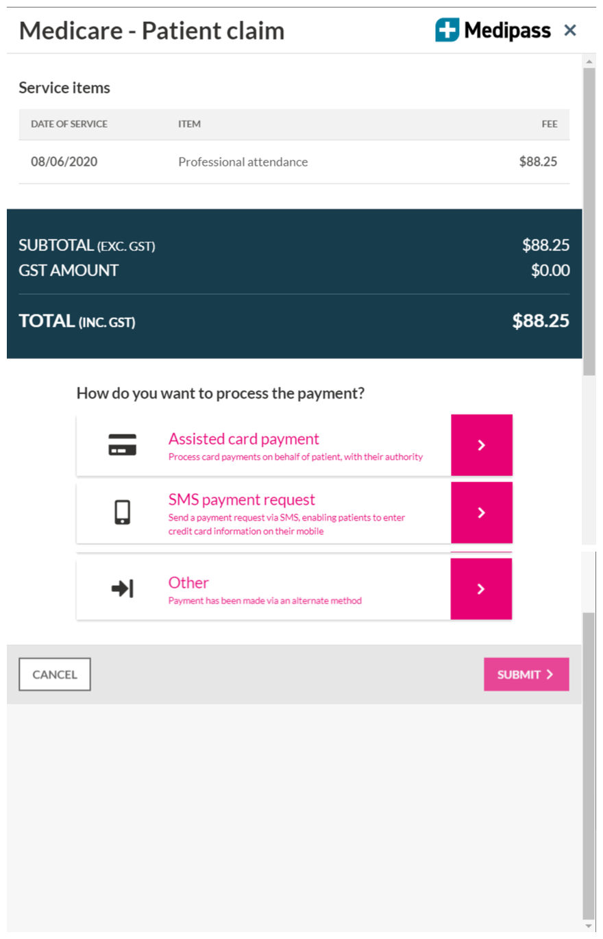 - Other: an alternative method. Once processed, the patient will be charged, and the rebate sent to Medicare to process. A statement will be generated within Medipass that includes all details of the claim and the expected benefit the patient will recoup as a rebate.