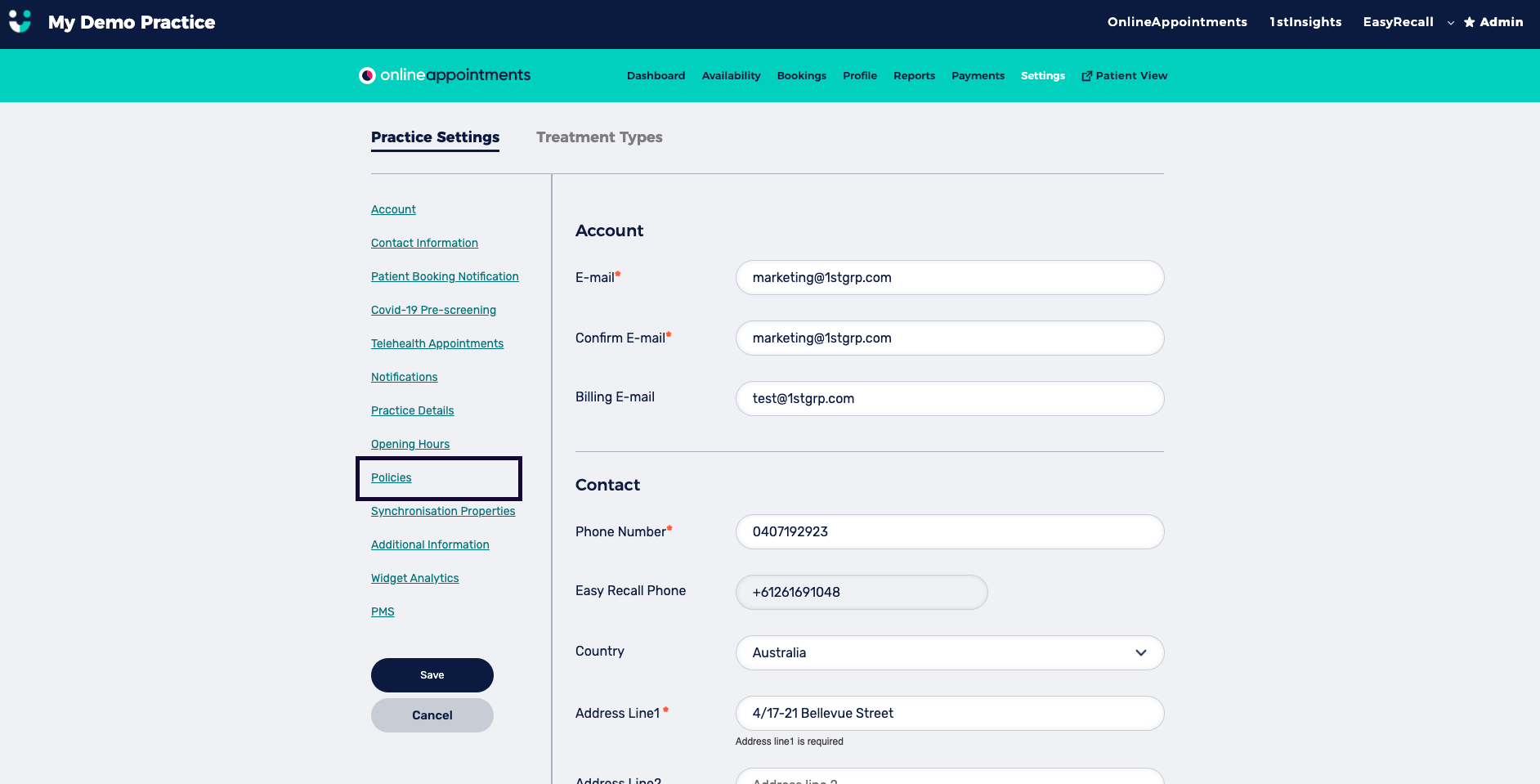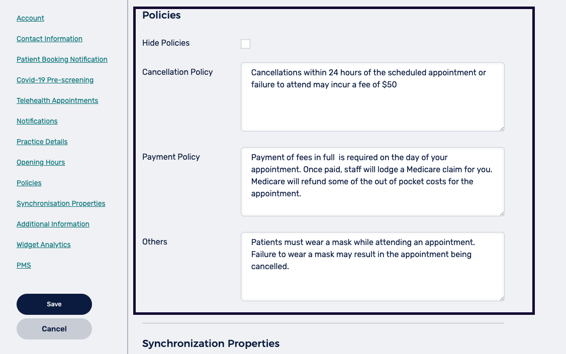 Editing your practice policies in MyHealth1st is easy, and allows you to efficiently inform any new patients of policies regarding attendance, payments and telehealth.