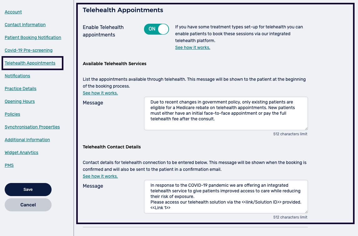 The “Telehealth Message” can be used to show this information when a patient tries to book an appointment.