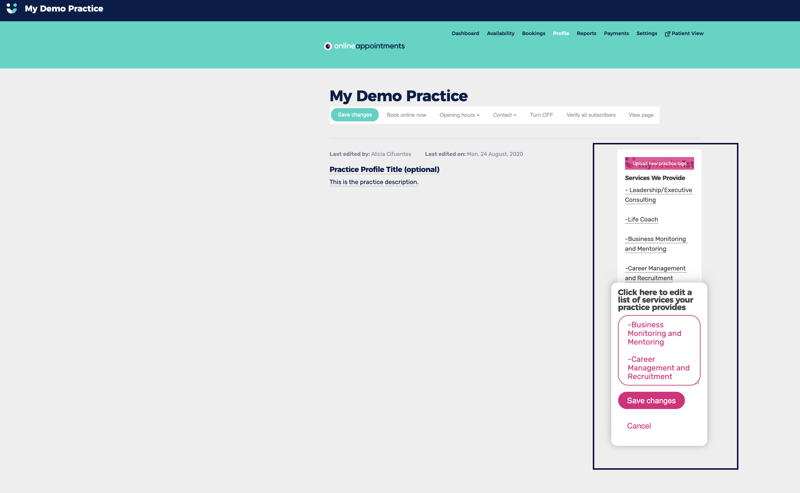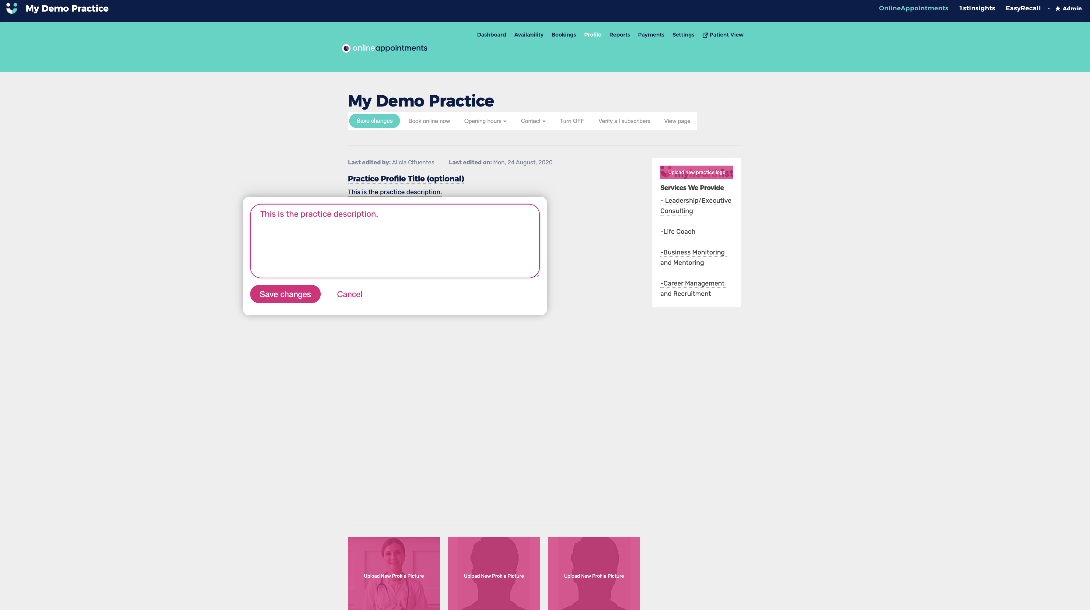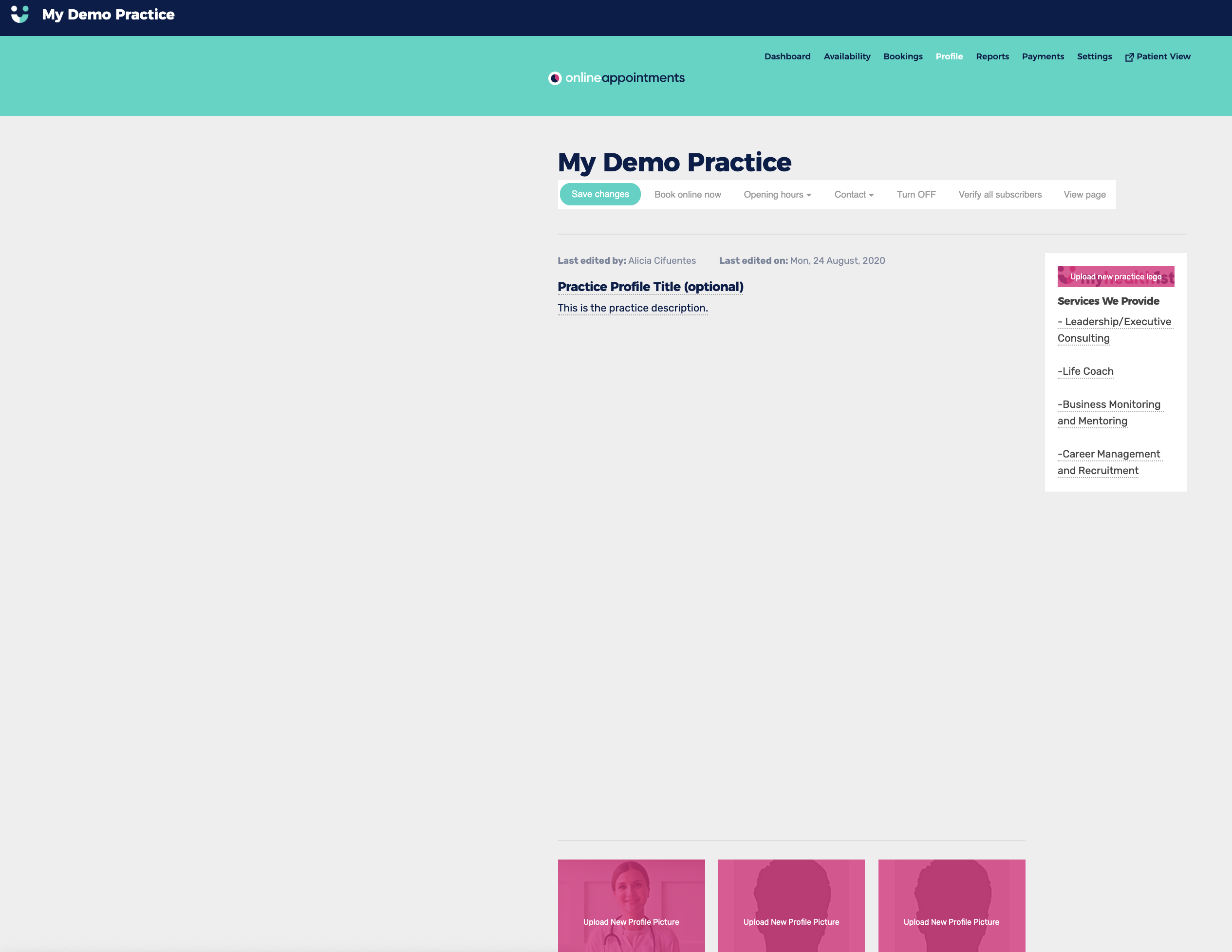 Practice Profile Title and Description Here is your chance to add all the information about you and your practice. Communicate the story of your business, how and when you started your practice, what makes it unique and why customers should choose you.