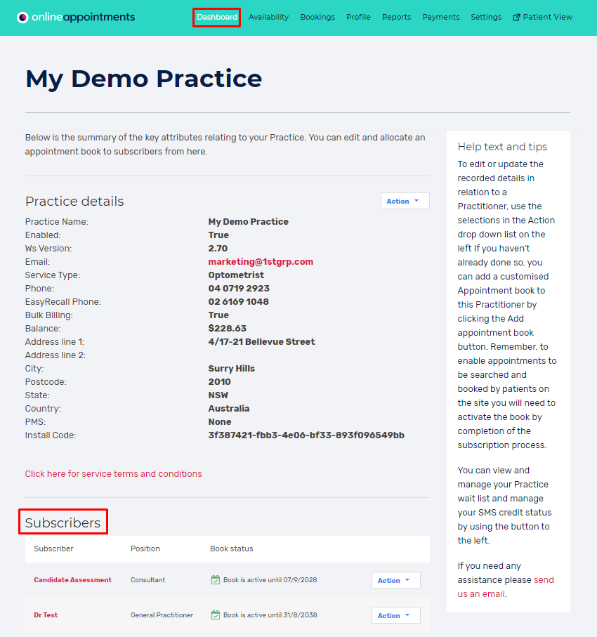 From the DASHBOARD , scroll down to view a list of practitioners at your practice: