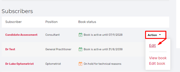 Each practitioner should have an ACTION dropdown menu next to their name. To retrieve their username and password, hover over ACTION and select EDIT :