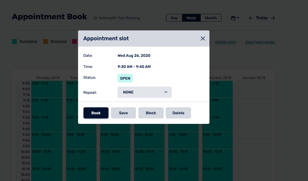 Find the date and time in which you wish to book the appointment and double click on the green appointment slot. A pop up window will appear. Click the “Book" button .