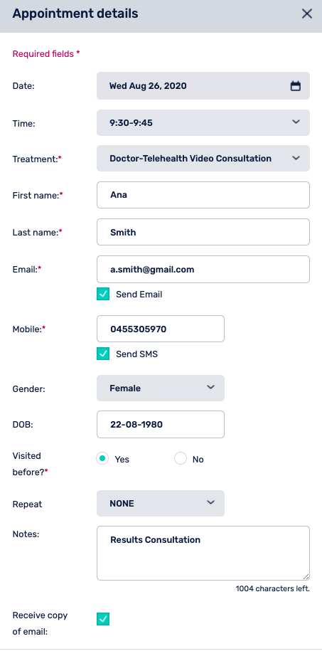 • Mobile. Send SMS is ticked by default if you do not require this or have not purchased SMS package you will need to untick this box. Patients will receive and email regardless.