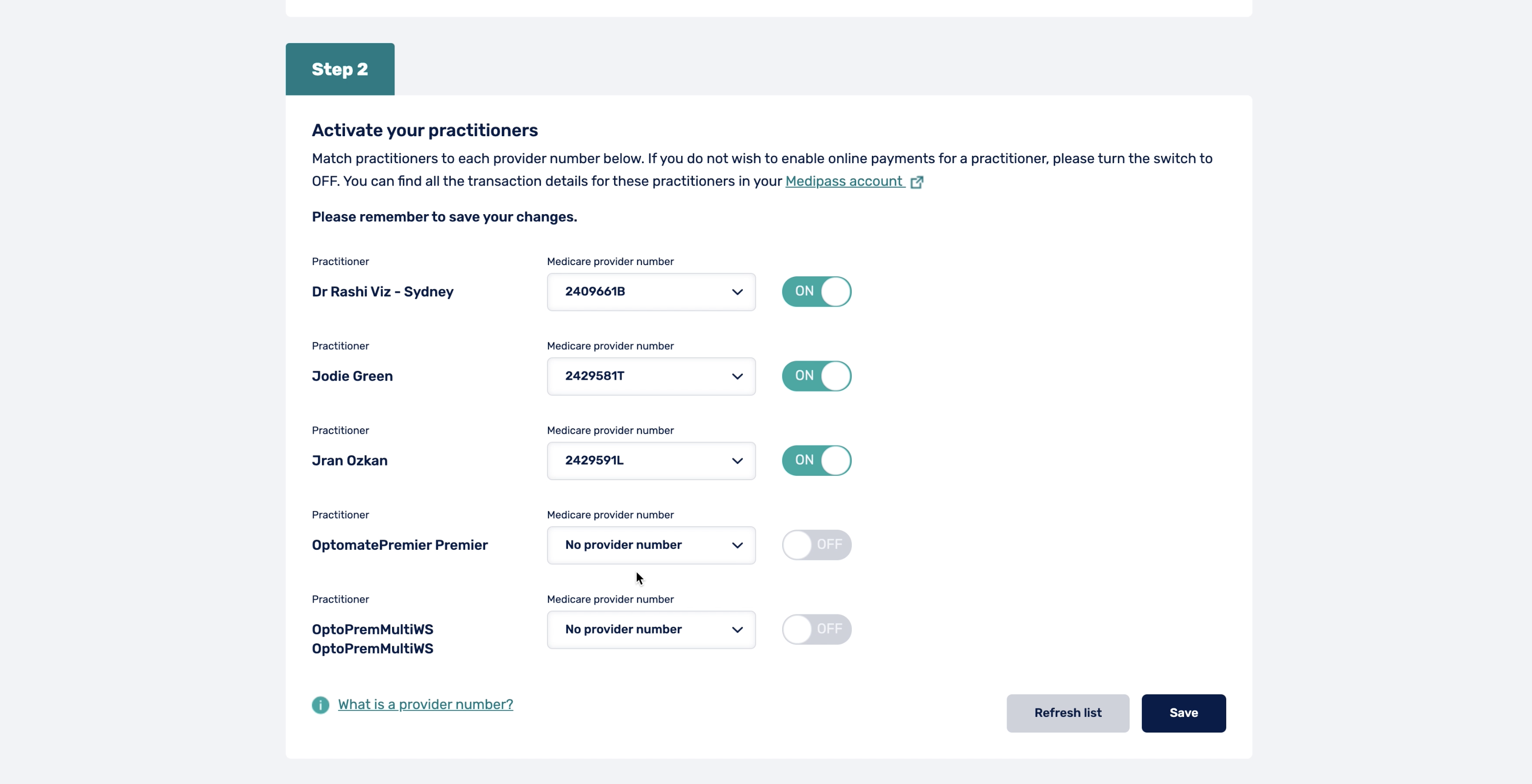 - Each provider number can only be assigned to one practitioner. A warning message will be displayed if you attempt to save this page with the same provider number assigned to two different practitioners.