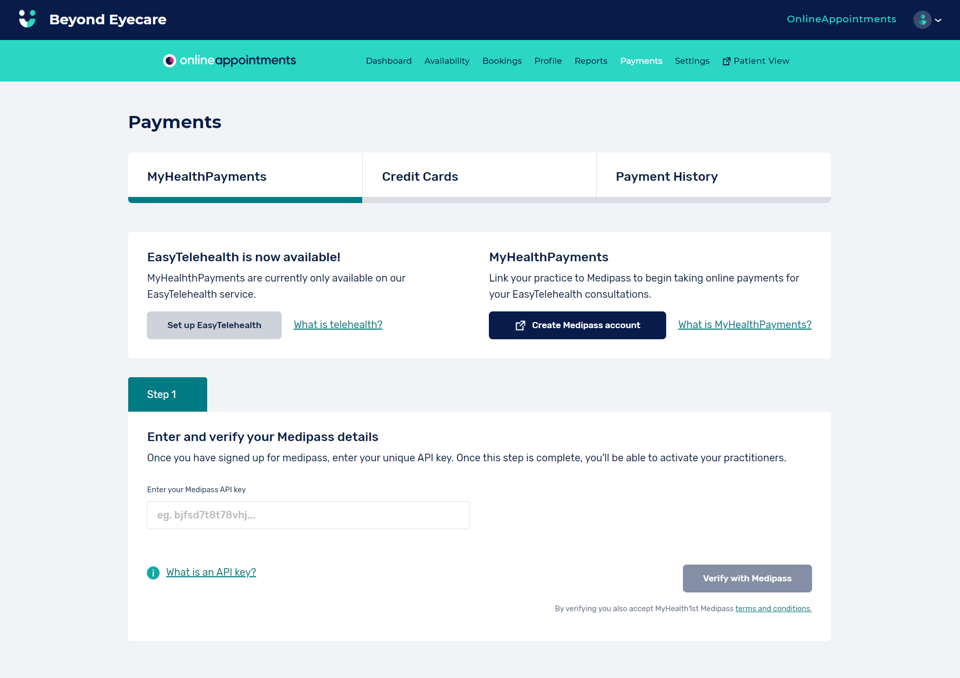 4. Generate API KEY in MedipassClick the API Keys tab at the top of the screen, and then click “Generate API Key”. This will generate an alphanumeric code. Copy this code and tab back to MyHealth1st