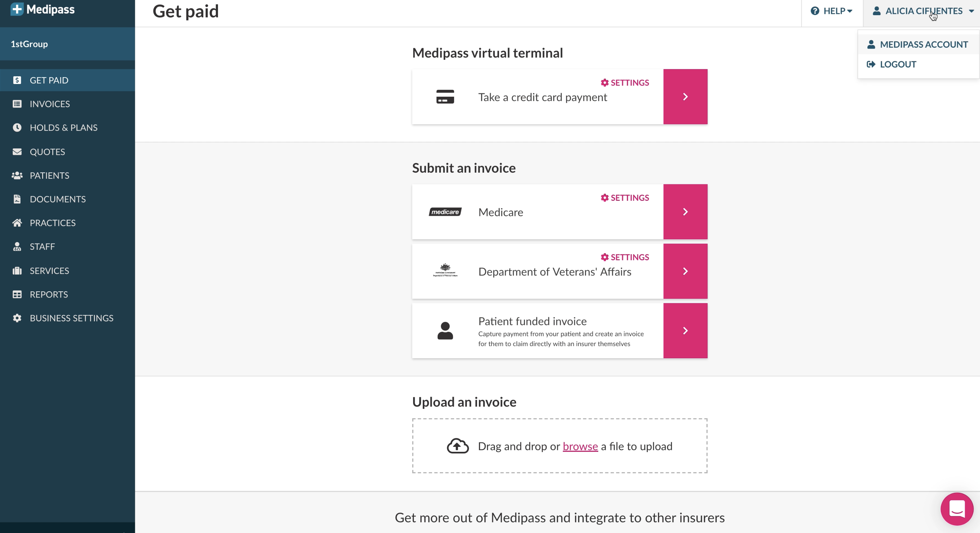 3. Create a Medipass Account. Once you sign into the account, click on the account name on the top right of the screen and choose Medipass Account from the drop down menu.