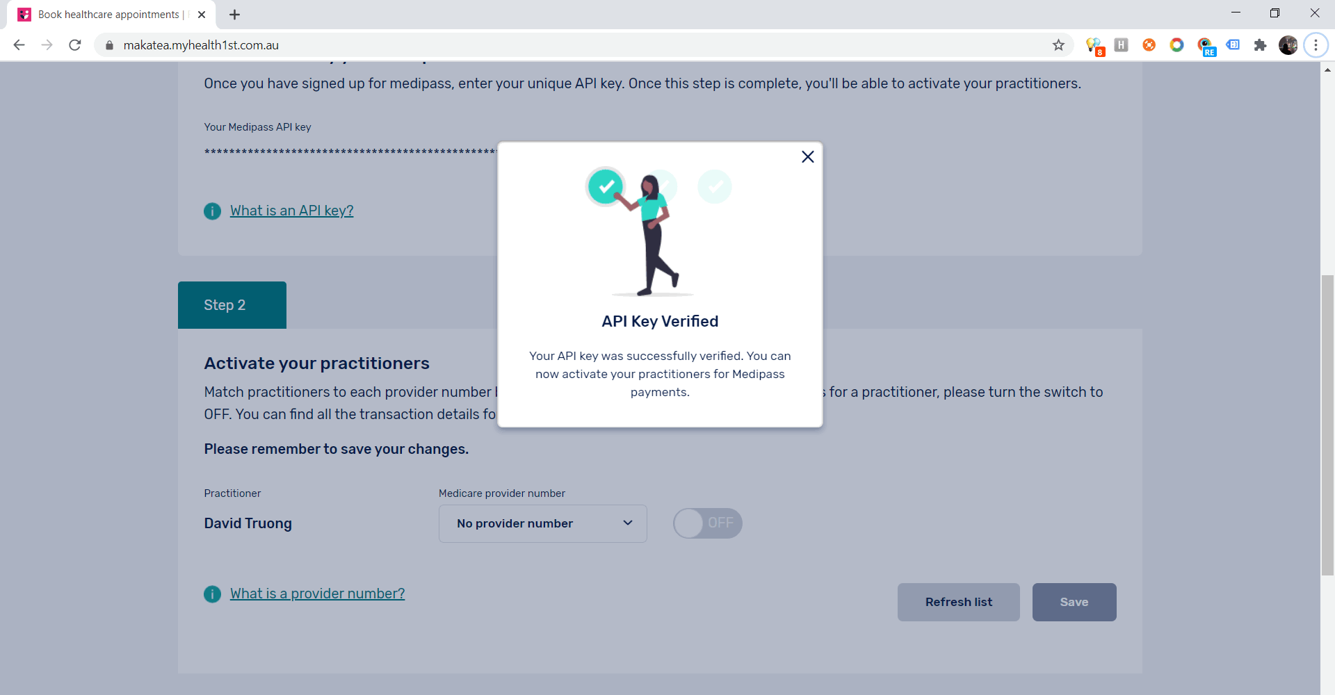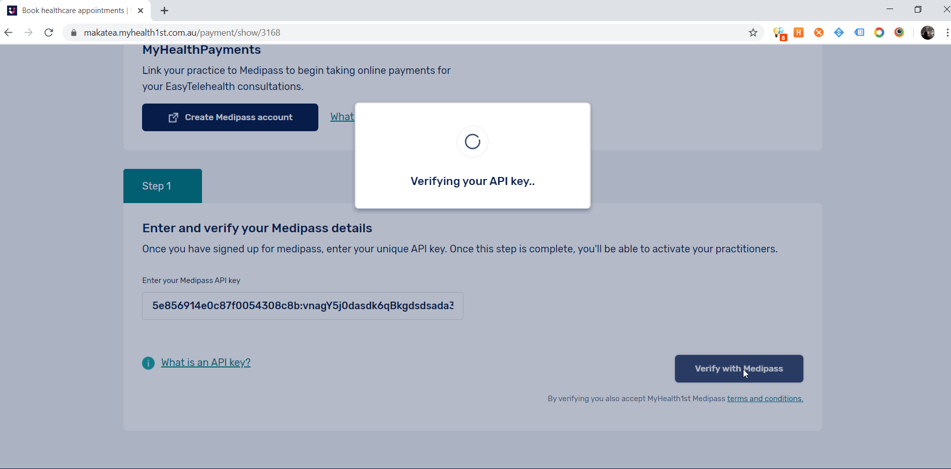 5. Go to MH1, and enter the valid Medipass API key and click 'Verify with Medipass' button.