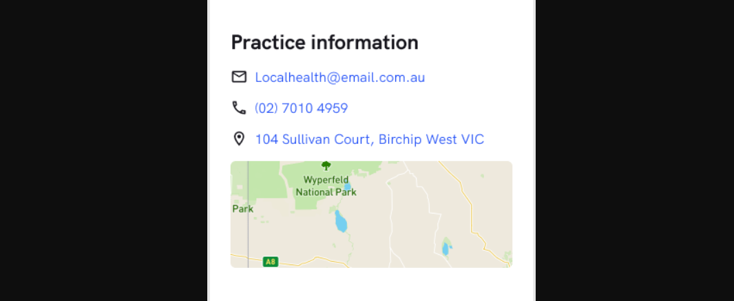 This section needs to contain the following information that will be used throughout the profile: A contact email address for the practice - this is typically the front desk/reception emailA contact phone number for the practiceThe address of your practice - this will autogenerate a Google Map.