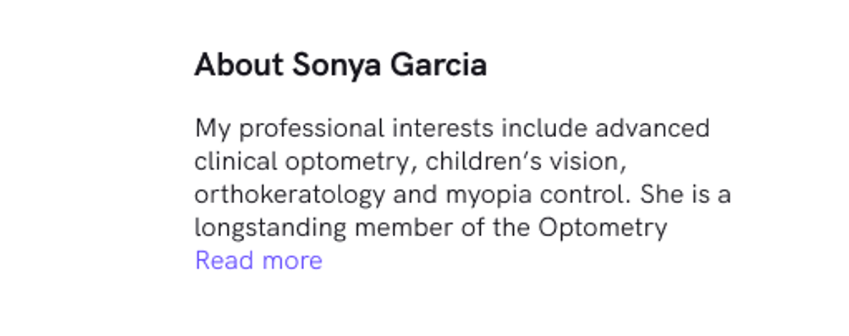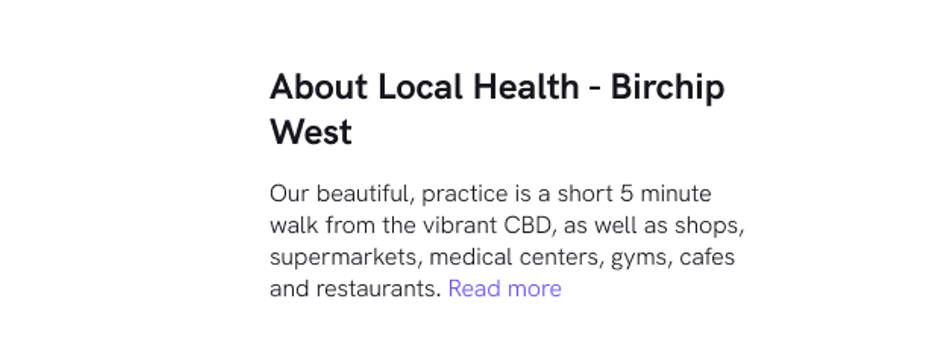 In the main page view, you only see a snapshot of the first few lines of the profile, so try to make them engaging and relevant to patients that are browsing your profile, such as:“X practice has been delivering first class Y care to the people of (suburb) since Z year.”