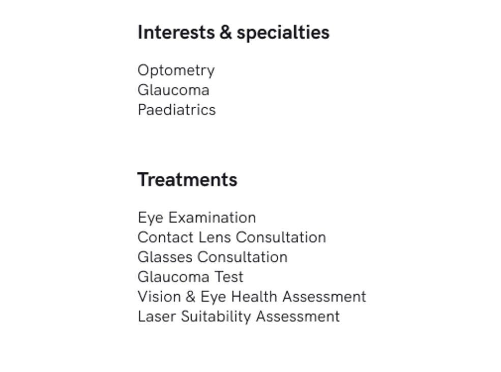This section should contain a comprehensive list of the services, specialities, treatments and products offered by your practice.
