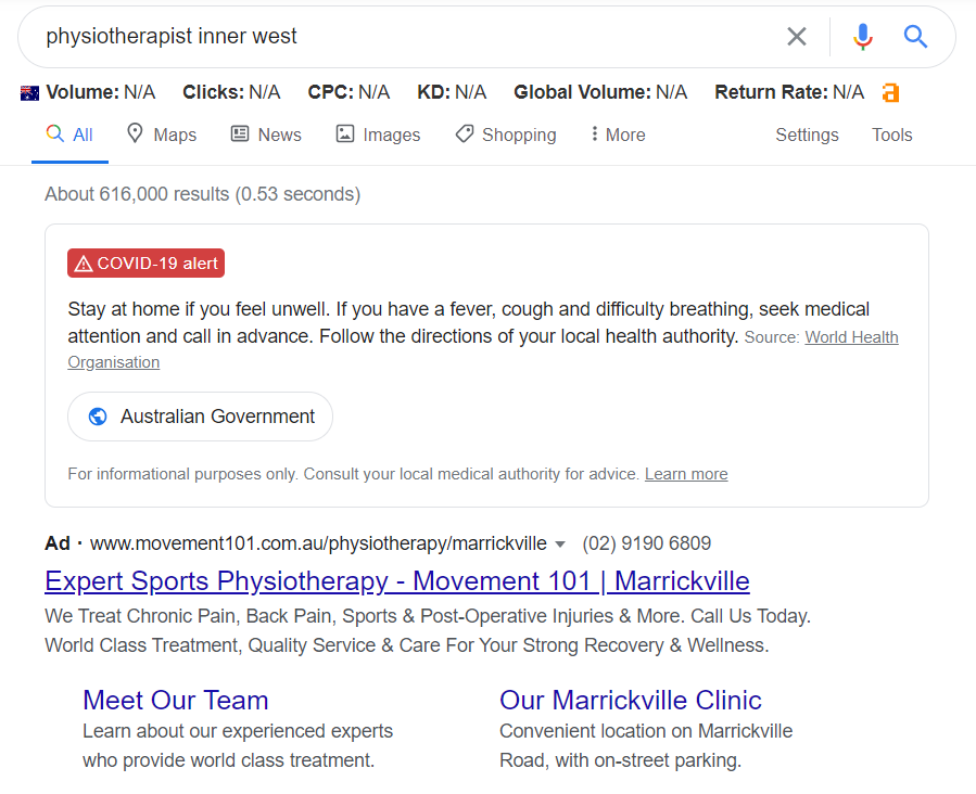 Although $4.50 was the price in the Sydney Inner West at the time of writing, it is worth noting that this price will vary minute by minute to a certain extent, and vary wildly across the country. A regional physiotherapist, for example, will most likely have a much smaller bid. These fluctuations in price aren’t arbitrary - Google Ads operate on an auction system, with multiple advertisers bidding on keywords, so the less local competition a keyword has the less expensive that keyword will be.