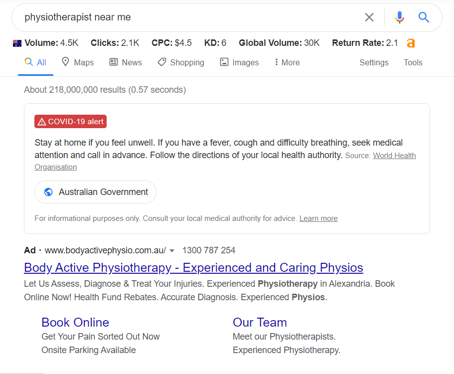 Once Google has decided on which ads to serve with the search, the “winners” are shown above the search results. According to Ahrefs, the estimated cost per click for “physiotherapist near me” is around $4.50, meaning that the advertisers shown will be charged around $4.50 for every click through to their site.