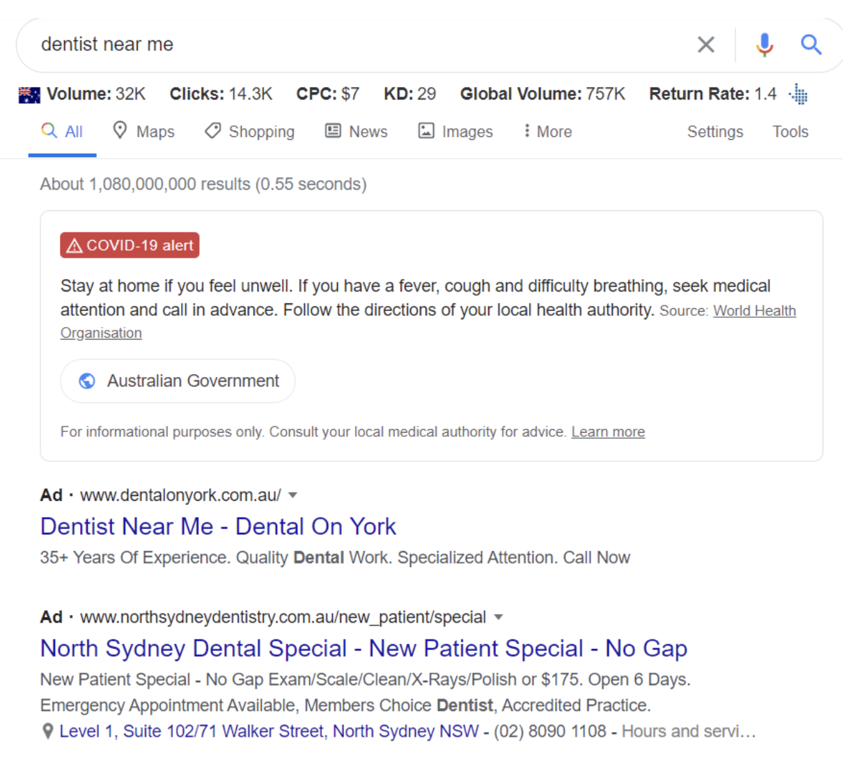 Once Google has decided on which ads to serve with the search, the “winners” are shown above the search results. According to Ahrefs, the estimated cost per click for “dentist near me” is around $7 , meaning that the advertisers shown will be charged around $7 for every click through to their site.